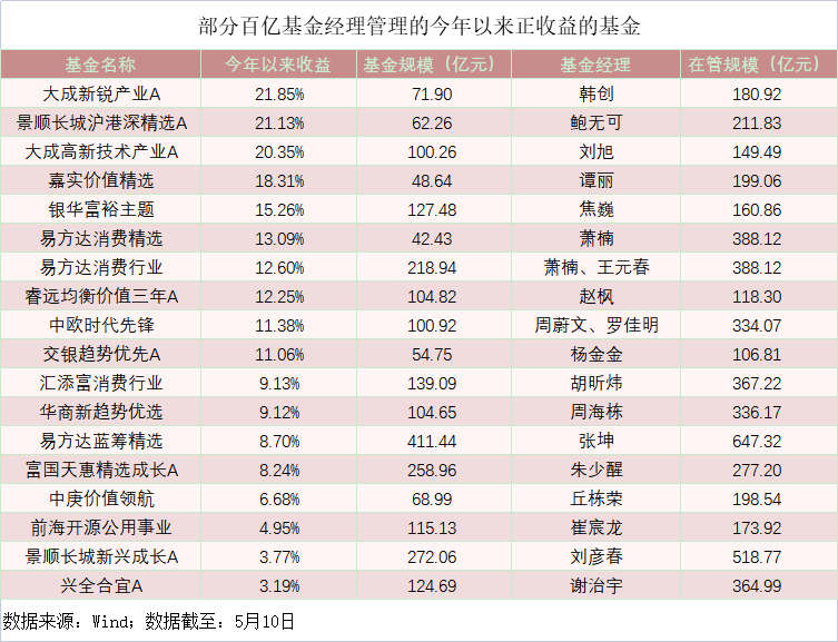 在百亿基金经理管理的基金中,截至5月10日,大成基金知名基金经理韩创管理的大成新锐产业A、景顺长城基金基金经理鲍无可管理的景顺长城沪港深精选A、刘旭管理的大成高新技术产业A,今年以来收益率均超20%。