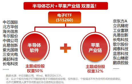 布局工具上,电子ETF跟踪中证电子50指数,双双覆盖半导体芯片和苹果产业链,截至3月31日,含“芯”量50%,含“果”量32%,荟聚AI芯片、消费电子、汽车电子、5G、云计算等热门产业龙头公司,一键布局A股电子核心资产。看好消费电子和半导体发展机遇的投资者,或可重点关注电子ETF。