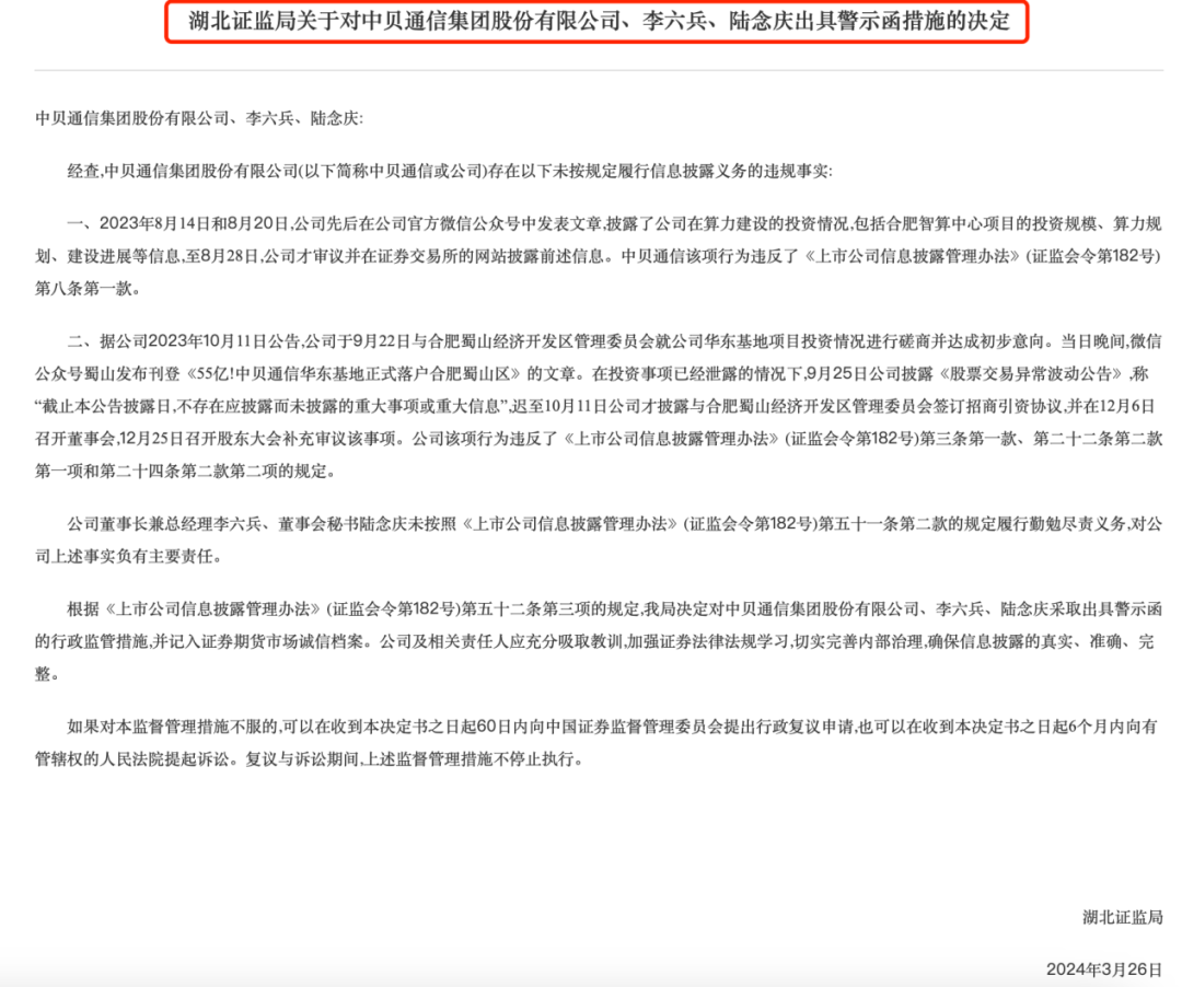 今年3月,湖北证监局对中贝通信、李六兵、陆念庆采取出具警示函的行政监管措施,主要原因是其存在未按规定履行信息披露义务的违规事实。