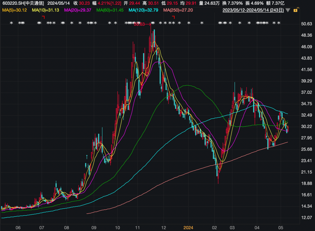 从股价表现来看,乘着算力概念的东风,中贝通信去年股价暴涨234.57%,一度涨至50.63元/股的历史高点。今年该股先跌后涨,一度跌至18.90元/股,2月到3月曾经出现一波凌厉的涨势,但近期回调也比较明显。截至5月14日收盘,中贝通信股价报收30.23元/股,今年下跌10.98%,最新总市值为101.34亿元。