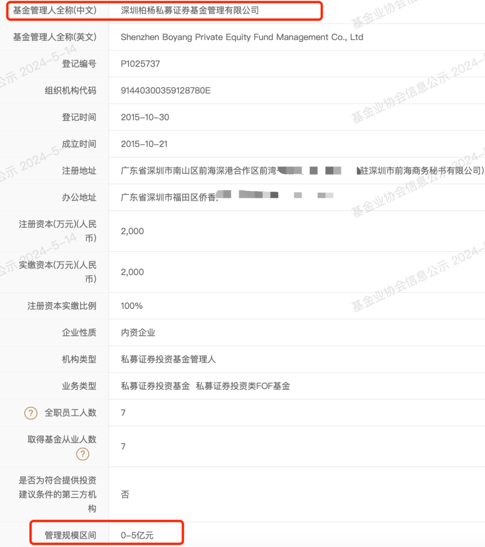 基金业协会网站信息显示,深圳柏杨私募证券基金管理有限公司成立于2015年10月,注册资本为2000万元,这家私募由王汉宝持股40%、张青青持股30%、聂光辉持股30%。目前公司管理规模仅仅在5亿元以内。