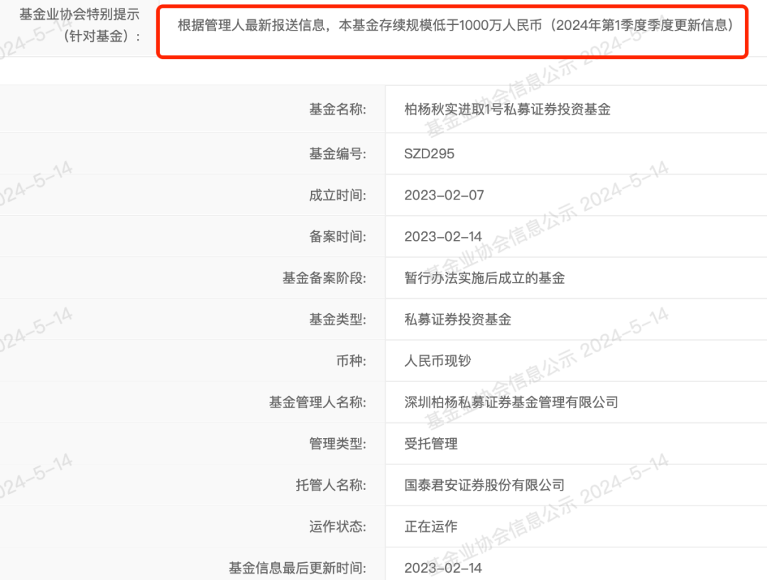 而此次拟“接盘”上市公司实控人持股的私募基金——柏杨秋实进取1号私募证券投资基金,成立于2023年2月7日,并在2023年2月14日完成备案,托管人为国泰君安证券。但值得注意的是,根据2024年第一季度更新的信息,该基金存续规模低于1000万元。