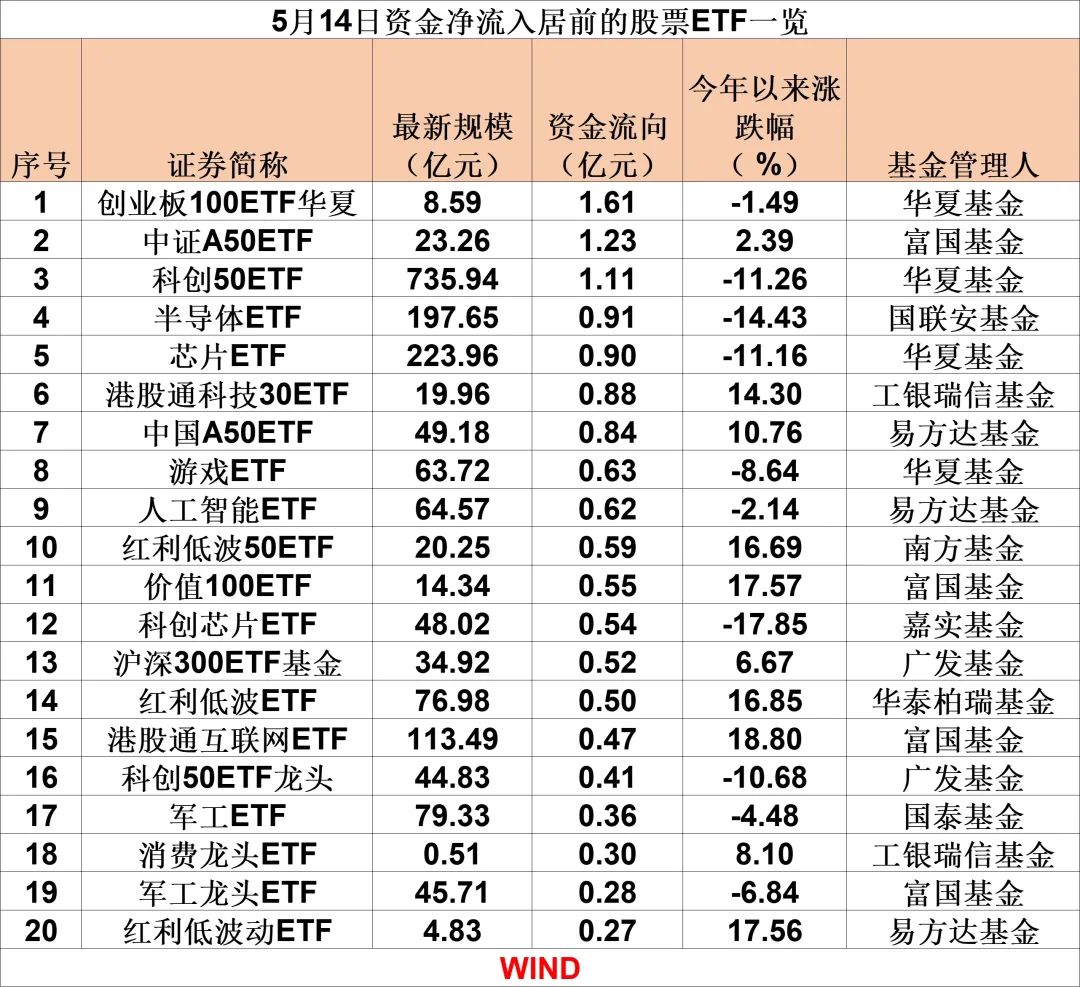 值得注意的是,一些市场热门的ETF产品继续强势吸金。如易方达旗下中国A50ETF 5月14日净流入0.84亿元,助推该ETF规模达到49.18亿元。此外,人工智能ETF、红利低波动ETF、中证1000指数ETF、港股通医药ETF也获得不同程度净流入。