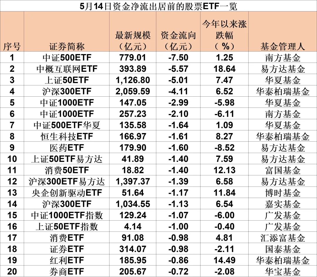 Wind数据显示,截至5月14日,全市场884只股票ETF(含跨境ETF)管理规模达2.16万亿元。5月14日,三大股指维持窄幅震荡走势。截至收盘,沪指微跌0.07%,深证成指跌0.05%,,创业板指跌0.26%。盘面上看,教育、家居、纺织服装、酿酒、汽车等板块走强,煤炭、燃气、银行等板块走弱。在这样的行情中,股票ETF整体资金净流出39.84亿元,细分品类中,宽基ETF净流出居前,达27.07亿元。