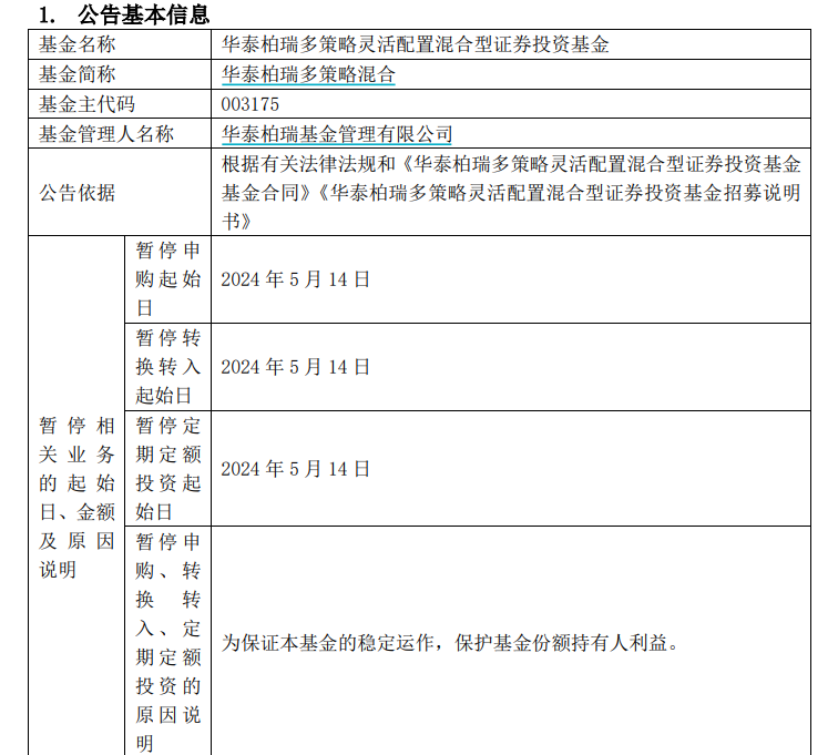 5月14日,华泰柏瑞基金发布公告称,华泰柏瑞多策略混合即日起暂停接受申购(含转换转入、定期定额投资)申请。
