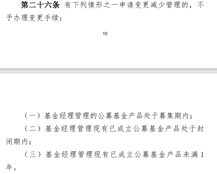 此外,第二十六条还明确指出,基金经理管理现有已成立公募基金产品未满一年,不予办理申请变更减少的手续。