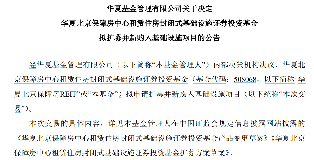 今日,华夏基金发布《关于决定华夏北京保障房中心租赁住房封闭式基础设施证券投资基金拟扩募并新购入基础设施项目的公告》(以下简称扩募公告)。