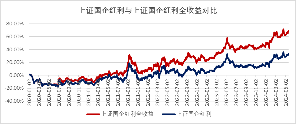 红利国企ETF标的指数为上证国企红利。如果把上证国企红利(不含成分股红利再投资收益)和上证国企红利全收益(包含成分股红利再投资收益)进行对比,可以看出,成分股分红带来的超额收益还是非常显著的。