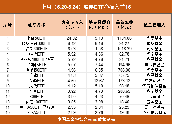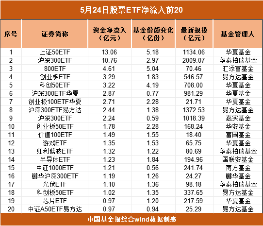 具体净流入方面,5月24日共有18只产品净流入超1亿元。其中,华夏基金旗下上证50ETF获得13.06亿元的净流入,最新规模达到1134.06亿元。华泰柏瑞基金旗下沪深300ETF、汇添富基金旗下800ETF分别以10.76亿元、4.61亿元的净流入排在第二、三位。