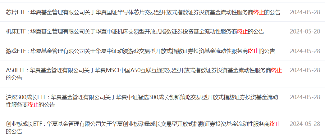 今日,华夏基金公告称,自2024年5月29日起,终止东海证券为华夏芯片ETF、华夏机床ETF、华夏游戏ETF等多只ETF提供流动性服务。