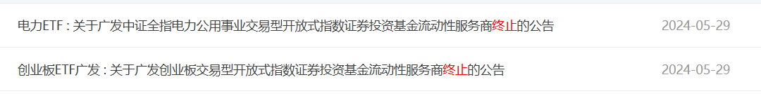 具体来看,广发基金公告称,自2024年5月29日起,终止东海证券为广发电力ETF、广发创业板ETF提供流动性服务。