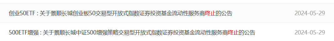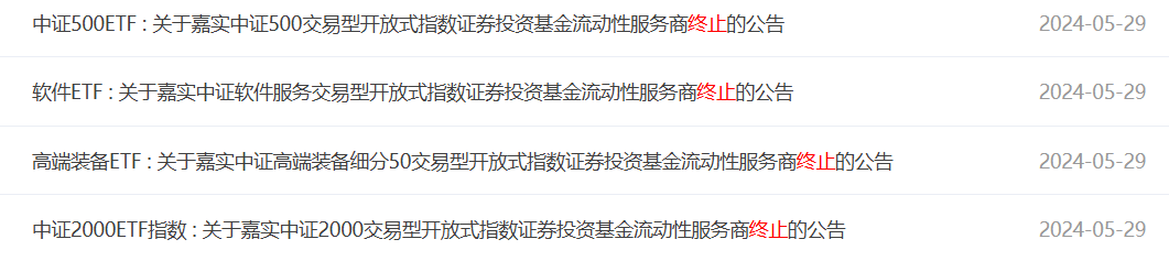 还有嘉实基金也公告称,自2024年5月30日起,终止东海证券为嘉实中证500ETF、嘉实软件 ETF、嘉实高端装备ETF等多只ETF提供流动性服务。