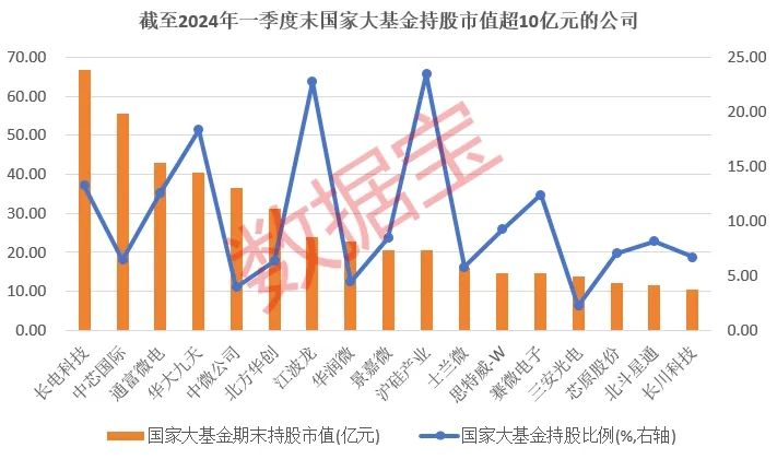 从持股市值来看(截至2024年一季度末),上述31家公司获国家大基金持股市值超10亿元的公司有17家,长电科技、中芯国际、通富微电位居前3名,持股市值分别为66.64亿元、55.65亿元及43.03亿元。
