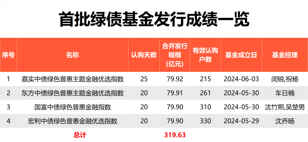 6月4日,嘉实基金发布公司旗下绿债基金合同生效公告,嘉实中债绿色普惠主题金融债券优选指数基金成立规模达79.92亿元,包括该只产品在内的首批四只绿债基金总计大卖320亿元,该类基金的发行也圆满收官。