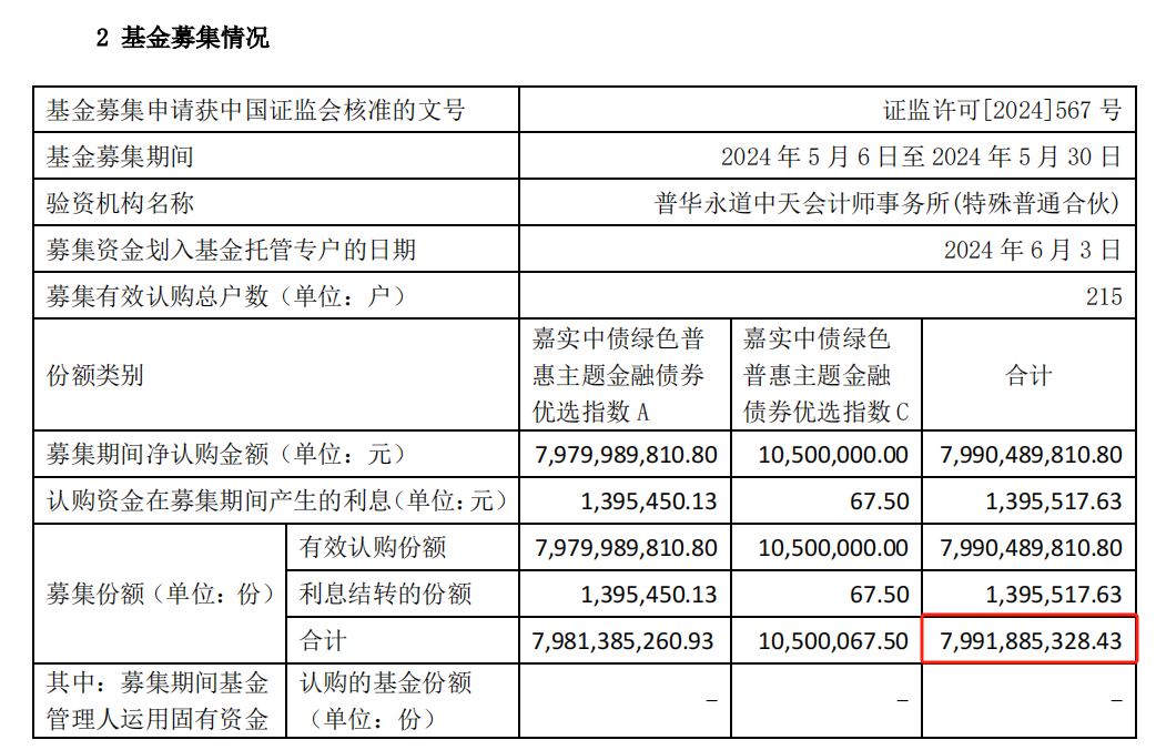 6月4日,嘉实基金发布新基金成立公告,公司旗下嘉实中债绿色普惠主题金融债券优选指数基金成立,募集总规模达到79.92亿元,基金合同生效日是6月3日。