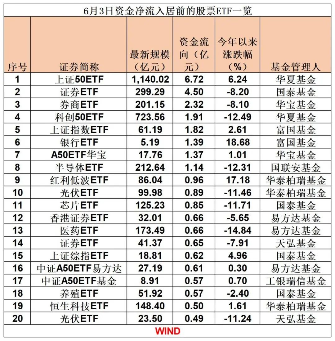 值得注意的是, 处于风口中的ETF仍获得资金青睐,如易方达旗下不少ETF获得净流入。数据显示,6月3日,黄金ETF当日获得1.02亿元净流入,此外,医药ETF、香港证券ETF、中证A50ETF易方达、红利ETF易方达获得不同程度净流入。