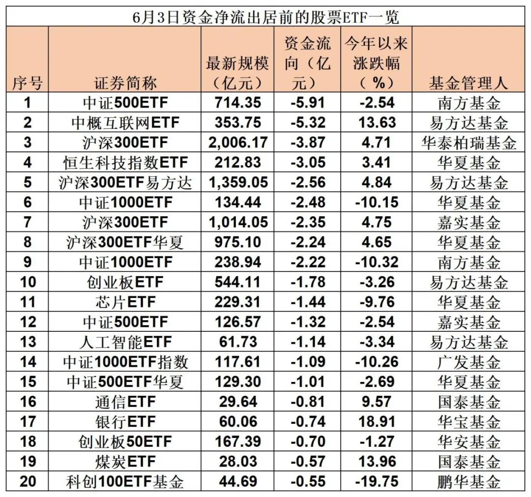 6月3日,A股三大指数涨跌互现,股票ETF整体资金净流出10.46亿元。细分品类中,行业ETF净流入居前,达13.95亿元。