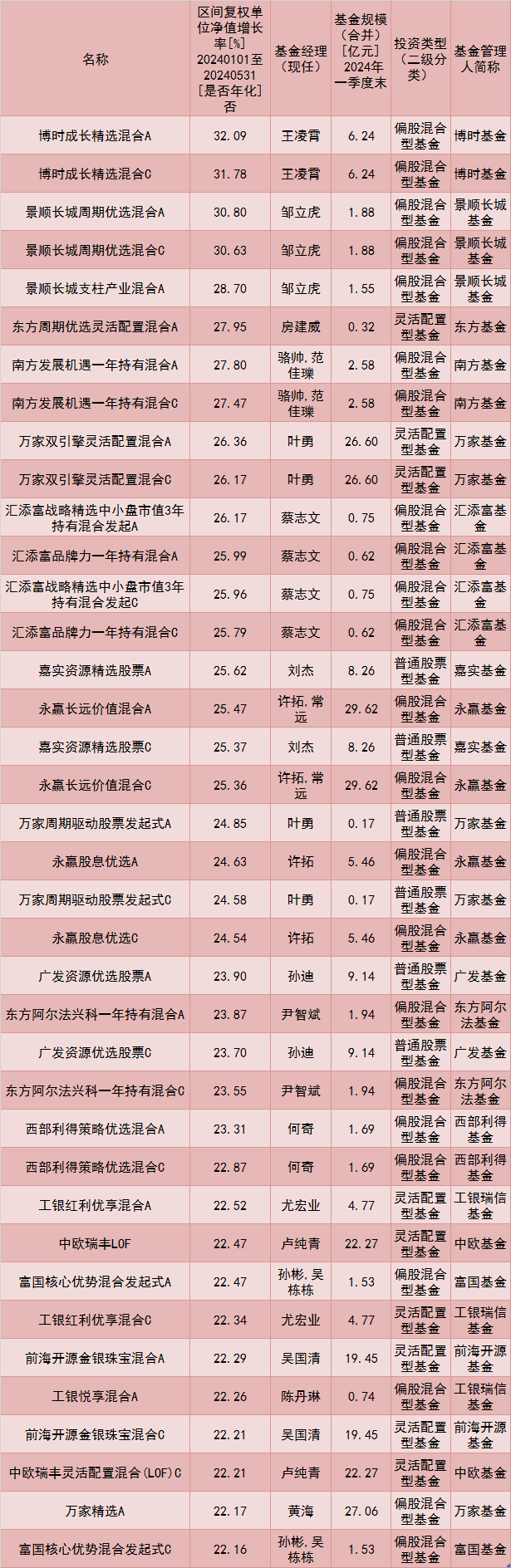 同花顺iFinD数据显示,2024年前5个月股票型基金收益率平均-1.6%,43.29%的股票型基金实现了正收益;混合型基金收益率平均-1.04%,51.47%的混合型基金实现了正收益。