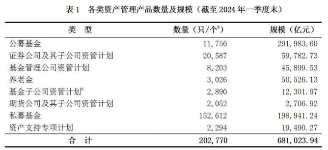中国基金业协会最新数据显示,截至2024年一季度末,基金管理公司及其子公司、证券公司及其子公司、期货公司及其子公司、私募基金管理机构资产管理业务总规模达68.1万亿元。