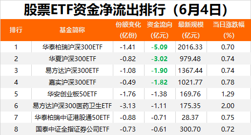 此外,易方达沪深300医药卫生ETF、华泰柏瑞中证港股通50ETF、国泰中证全指证券公司ETF等均有不同程度资金净流出。
