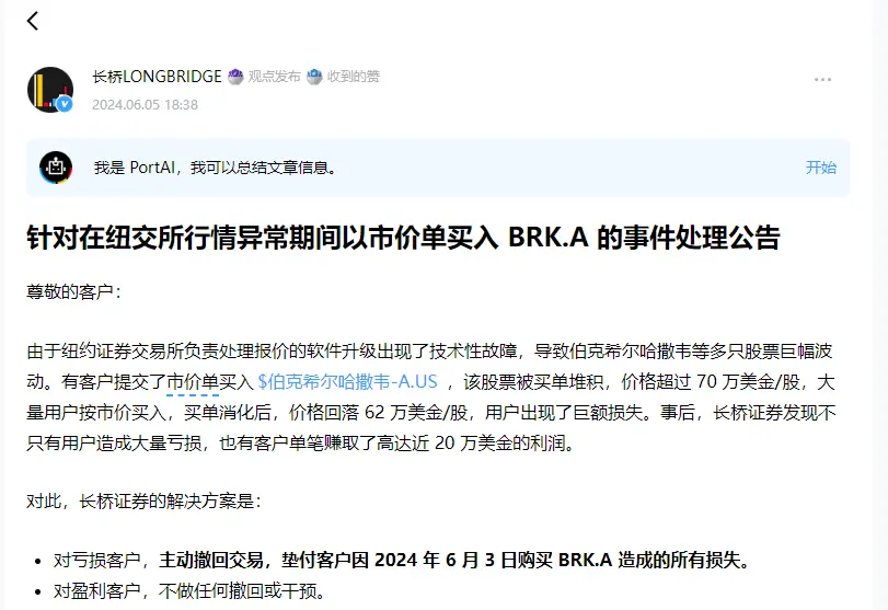对此,长桥证券的解决方案是,对亏损客户,主动撤回交易,垫付客户因2024年6月3日购买伯克希尔·哈撒韦A股票造成的所有损失;对盈利客户,不做任何撤回或干预。
