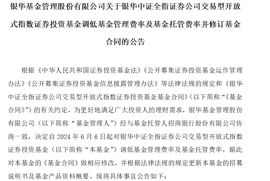 6月6日,银华发布公告宣布,经管理人与基金托管人协商一致,银华中证全指证券公司ETF(场内简称“券商ETF”)于6月6日起,将管理费年费率由0.5%下调至0.15%,托管费年费率由0.1%调低至0.05%。
