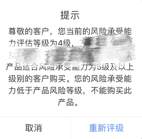 “我原先在某银行的风险评级为4级,能够购买其代销的5级风险评级的基金产品,但近日我无法再购买此类高风险产品了。”北京市西城区投资者汪洋(化名)透露。
