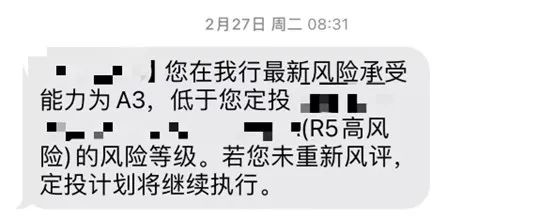 北京市西城区的投资者安吉(化名)表示,她在某股份制银行的风险评级为A3稳健型。今年2月末,她通过该行的手机银行APP定投了一款R5风险评级的基金产品。在操作过程中,该行只是向她发送了关于超出风险评级购买的提示短信,表明若未重新进行风险评估,定投计划将继续执行。