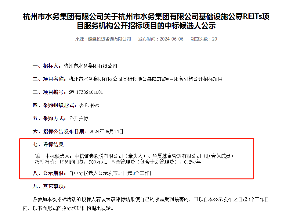 6月7日,官方采购网平台信息显示,杭州市水务集团有限公司基础设施公募REITs项目服务机构公开招标项目正在公示中标候选人结果,中信证券联合华夏基金拟中标该项目。