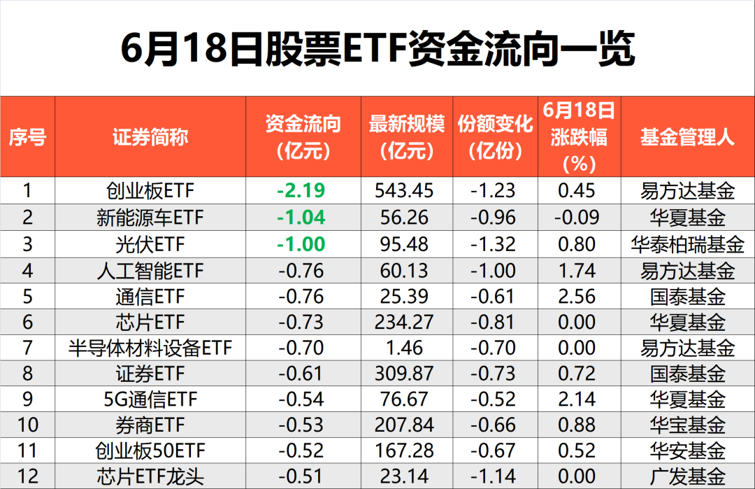 数据显示,6月18日,创业板ETF净流出最多,达到2.19亿元;同样跟踪创业板相关指数的创业板50ETF也有超过5000万元的净流出。
