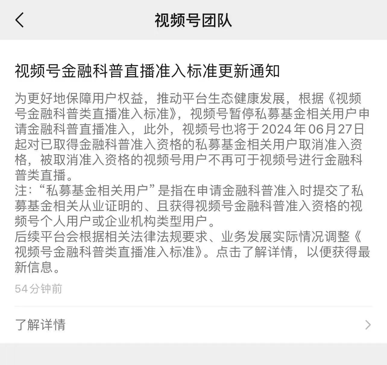 从6月27日起视频号对已取得金融科普准入资格的私募基金相关用户取消准入资格,被取消准入资格的视频号用户不再可于视频号进行金融科普类直播。