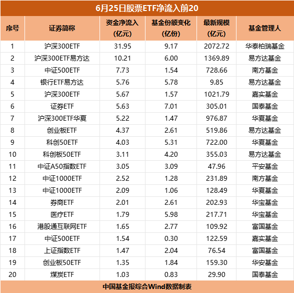 具体来看资金净流入情况,6月25日共有20只产品净流入超1亿元。其中,华泰柏瑞基金旗下沪深300ETF以31.95亿元的净流入排在首位,沪深300ETF易方达、中证500ETF分别以10.21亿元、7.73亿元排在第二和第三位。