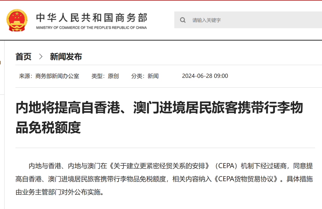 6月28日早间,根据商务部网站消息,内地与香港、内地与澳门在《关于建立更紧密经贸关系的安排》(CEPA)机制下经过磋商,同意提高自香港、澳门进境居民旅客携带行李物品免税额度,相关内容纳入《CEPA货物贸易协议》。具体措施由业务主管部门对外公布实施。