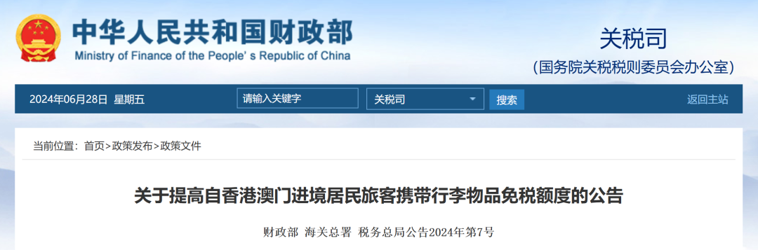 随后,财政部、海关总署、税务总局三部门联合发布关于提高自香港澳门进境居民旅客携带行李物品免税额度的公告。