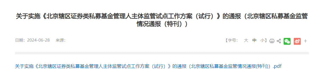 6月28日,北京证监局官网发布了关于实施《北京辖区证券类私募基金管理人主体监管试点工作方案(试行)》(以下简称《方案》)的通报。