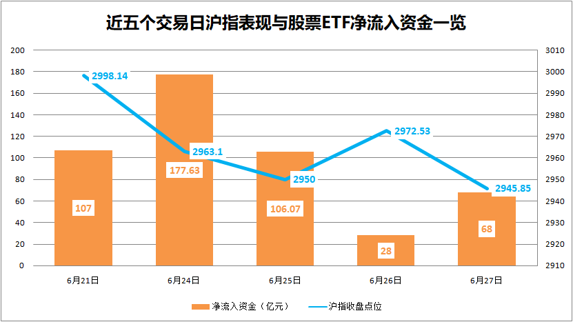 值得注意的是,近期沪指跌破3000点,资金借道股票ETF投资工具“越跌越买,大跌大买”,在股市调整期间明显看到资金净买入,当日跌幅较大时,资金买入体量还明显放大。自6月21日至今,五个交易日已经狂买近500亿元。