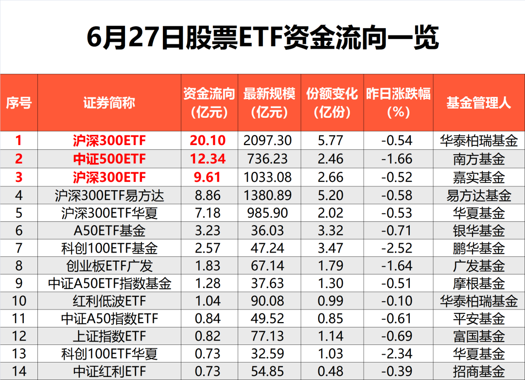 截至6月27日,易方达旗下ETF合计获得12.27亿元。其中,沪深300ETF易方达当日获得8.86亿元净流入,黄金ETF、医药ETF、中证A50ETF易方达、红利ETF易方达也获得超不同程度净流入。