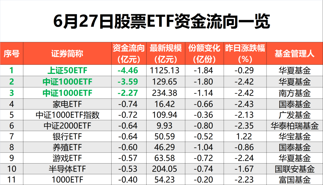 在行业和主题ETF中,家电ETF、银行ETF、养殖ETF、游戏ETF、半导体ETF等,位居行业的前列,但净流出资金体量不超过1亿元。