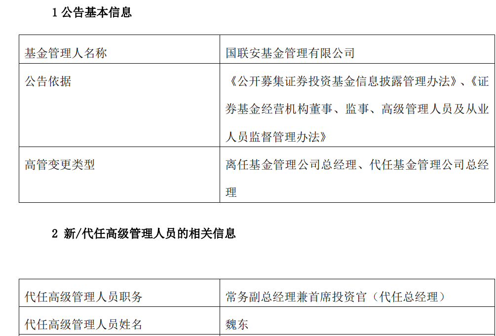 6月28日,国联安基金发布《高级管理人员变更公告》。公告显示,原总经理王琤因退休离任,离任日期为2024年6月26日。同时宣布,由常务副总经理兼首席投资官魏东代任总经理。