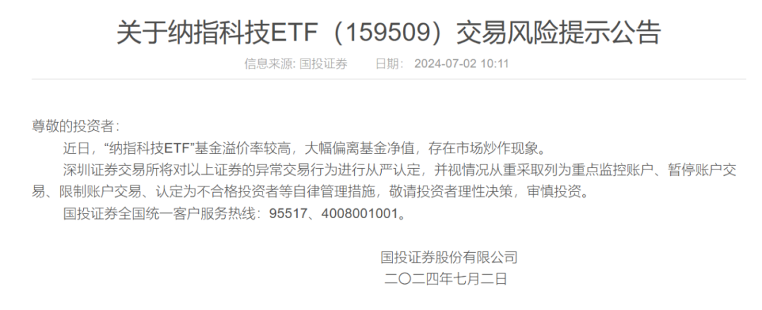 7月2日,国投证券、兴业证券等多家券商发布的公告显示,近日,纳指科技ETF溢价率较高,大幅偏离基金净值,存在市场炒作现象。深圳证券交易所将对其异常交易行为进行从严认定,并视情况从重采取列为重点监控账户、暂停账户交易、限制账户交易、认定为不合格投资者等自律管理措施,请投资者理性决策,审慎投资。