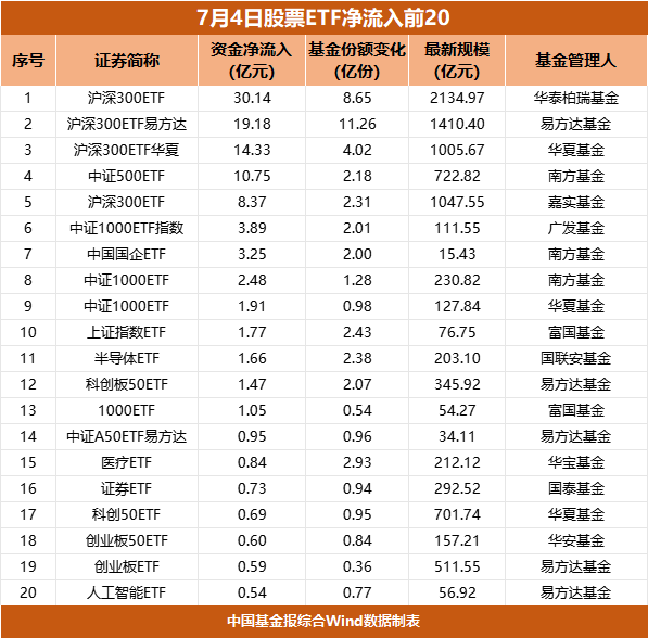头部基金公司旗下ETF持续受到资金青睐。数据显示,7月4日,易方达基金旗下ETF合计获得22.47亿元净流入。除前述沪深300ETF位居第二外,科创板50ETF、中证A50ETF易方达、创业板ETF、人工智能ETF也获得不同程度的净流入。