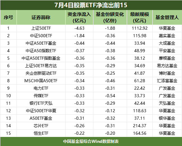 资金净流出方面,7月4日,上证50ETF、中证500ETF、中证A50ETF基金等多只宽基ETF产品“失血”较多。