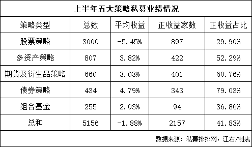 根据三方平台私募排排网数据,截至今年6月30日,有业绩记录的5156家私募旗下五大策略私募证券产品上半年平均收益为-1.88%,其中2157家实现正收益,占比为41.8%。分策略来看,私募旗下债券策略表现突出。有债券策略业绩显示的434家私募旗下债券策略上半年平均收益为4.79%,其中343家实现正收益,占比为79.00%。