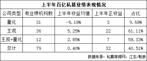 虽然6月市场走弱,百亿私募6月也遭遇较大回撤,但上半年依然维持了正收益。私募排排网数据显示,截至6月30日,有业绩记录的79家百亿私募,上半年收益均值为0.40%,其中32家实现正收益,占比为40.51%。