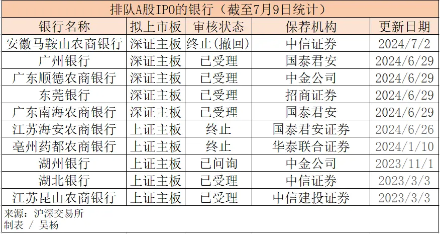 去年初,全面注册制启动,10家拟上市银行平移至交易所。截至目前,共有7家银行仍在A股IPO“门外候场”。上交所主板3家,分别为湖州银行、湖北银行、昆山农商银行,其中,仅湖州银行审核状态为“已问询”,其余为“已受理”;深交所主板4家,分别为广州银行、顺德农商银行、南海农商银行、东莞银行,审核状态均于6月29日更新为“已受理”。