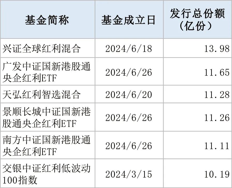 从新基金发行情况看,涌现出多只“10亿基”。例如,兴证全球红利、广发中证国新港股通央企红利ETF、天弘红利智选、景顺长城中证国新港股通央企红利ETF、南方中证国新港股通央企红利ETF等发行规模均在10亿元以上。其中,兴证全球红利是今年以来发行规模最大的主动权益基金。