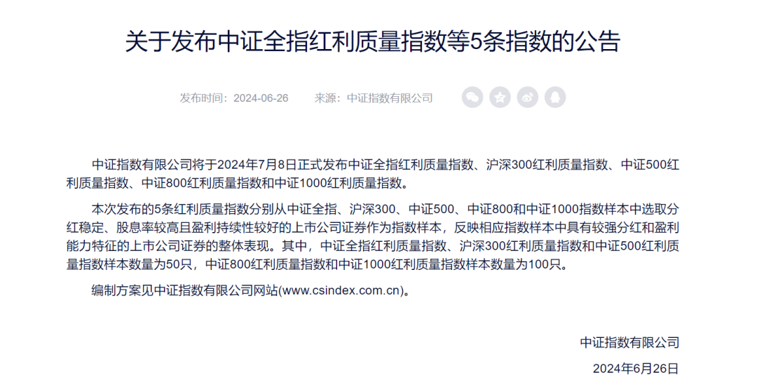后续还有更多新品有望推出。7月8日,中证指数有限公司发布中证全指红利质量指数、沪深300红利质量指数、中证500红利质量指数、中证800红利质量指数和中证1000红利质量指数。业内人士表示,随着上述指数的发布,相关产品有望持续推出。