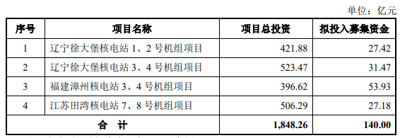 中国核电本次定增拟募资不超过140亿元,用于辽宁徐大堡核电站、福建漳州核电站和江苏田湾核电站等项目。
