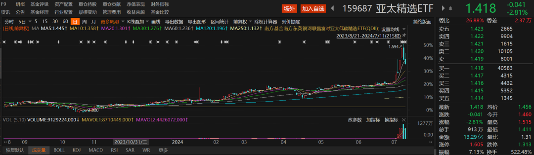 从南方亚太精选ETF二级市场表现看,7月1日至9日,南方亚太精选ETF涨幅超24%,7月10日大跌6%以上。从7月10日的成交情况看,场内价格也是“上蹿下跳”,具体而言,南方亚太精选ETF从下跌超4%,到上涨超1%,最终收跌6.11%。