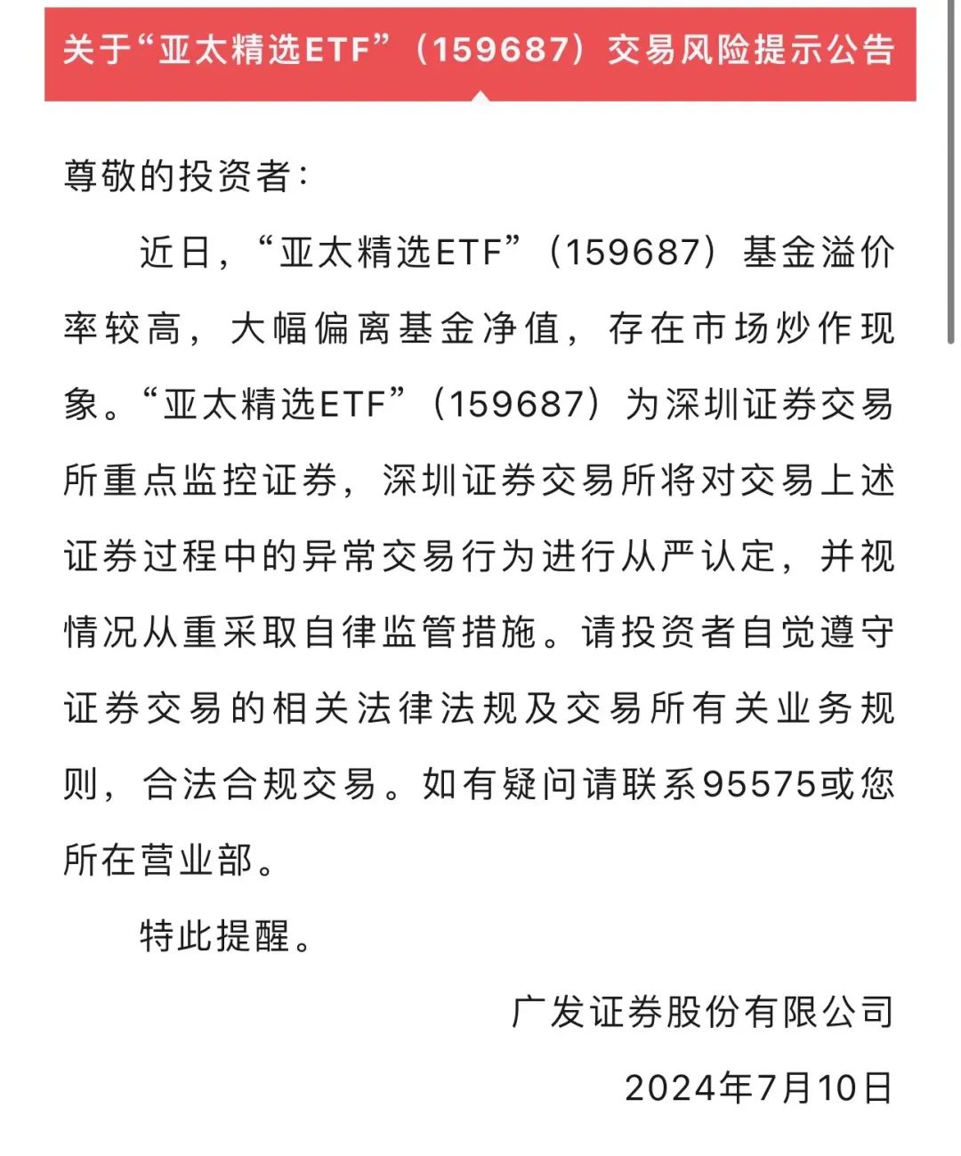 深圳证券交易所已对南方亚太精选ETF进行重点监控。多家券商已紧急提醒,广发证券表示,亚太精选ETF基金溢价率较高,大幅偏离基金净值,存在市场炒作现象。亚太精选ETF为深圳证券交易所重点监控证券,深圳证券交易所将对交易上述证券过程中的异常交易行为进行从严认定,并视情况从重采取自律监管措施。